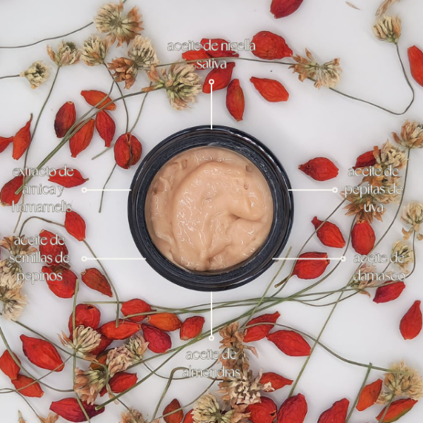 El extracto de árnica y el hamamelis aportan propiedades descongestivas y suavizantes, ideales para pieles que se irritan con facilidad.