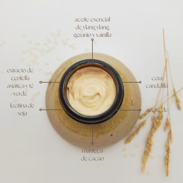 La fórmula se completa con aceite de pepitas de uva, coco, oliva y salvado de arroz, manteca de cacao, cera candelilla, aloe vera y extractos de centella asiática y té verde.
